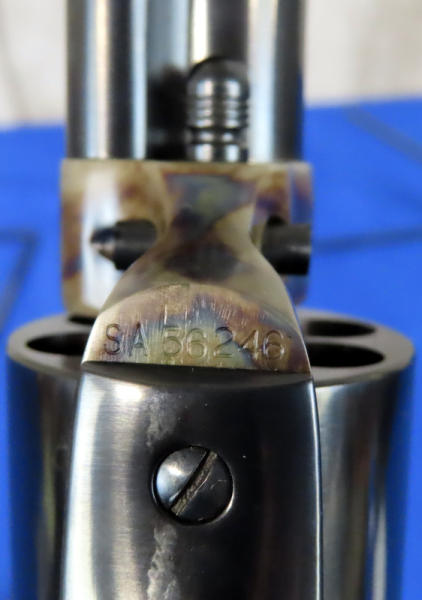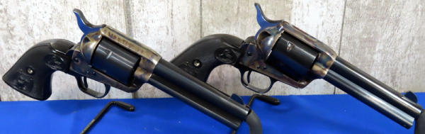 WOW, one of the highlights when it comes to the handguns! This firearms are identical and mint/unfired; 4.75" BBLs; case hardened receiver; checkered factory plastic grips; 6-shot fixed cylinders; comes in a glass face display case; these are consecutive SN#'s - SA56246 & SA56247; sell for one money; A29