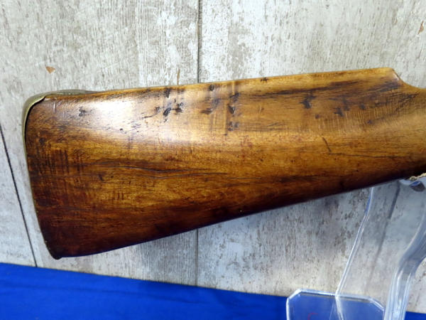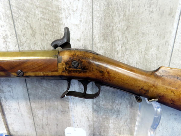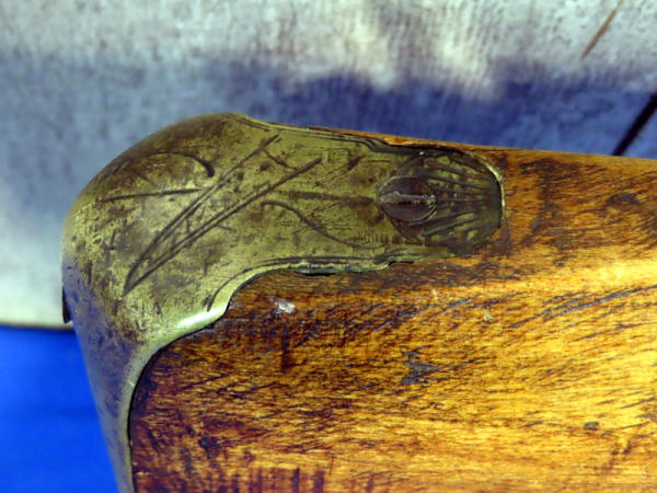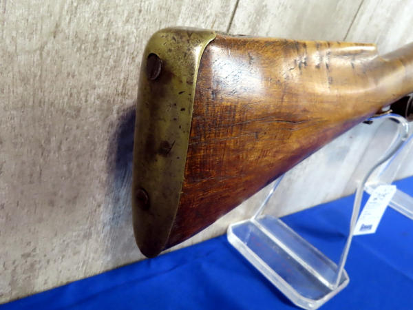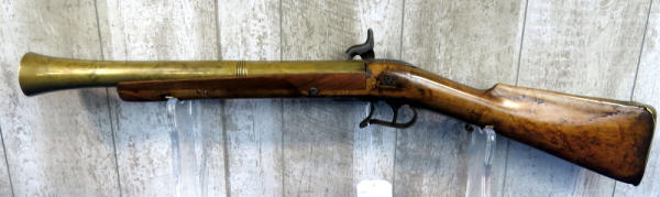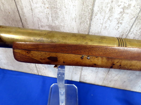 18" Brass Barrel w/Bell muzzle; right side plate is marked "Barnett - London - 1886"; Hammer Mechanism & trigger work; brass butt plate; wood has a few cracks and parts that have been fixed over time; barrel has some dings from use; muzzle is 2.25" in diameter! very early and unique antique firearm! No Transfer needed
