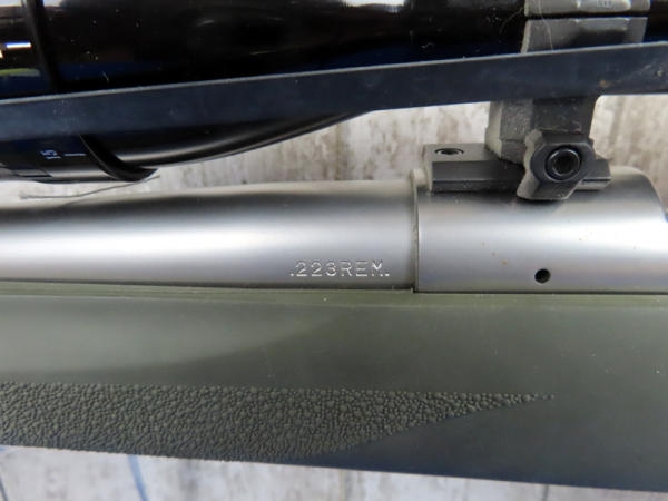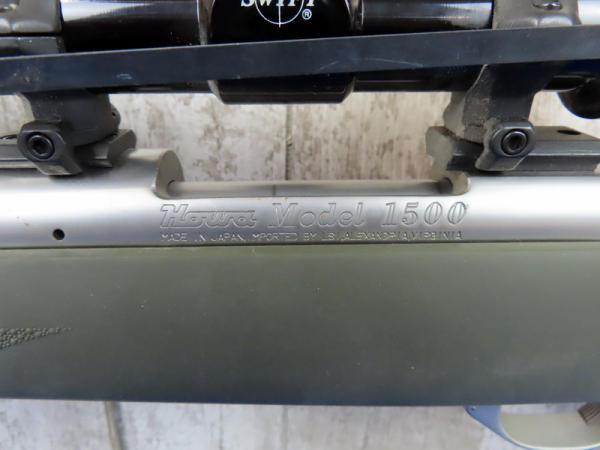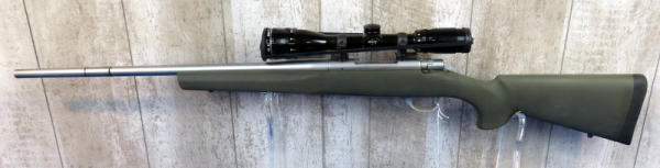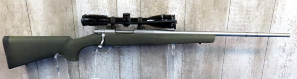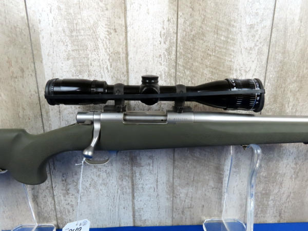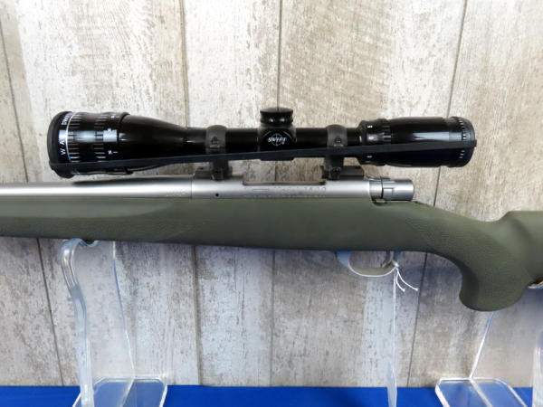 "GFE"; 22" Stainless barrel; has some tar or glue near the muzzle; Hogue green rubberized stock; smooth action; Swift 4-12x40 scope; Japan; SN#B084737; A30