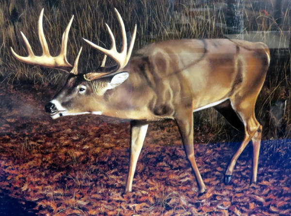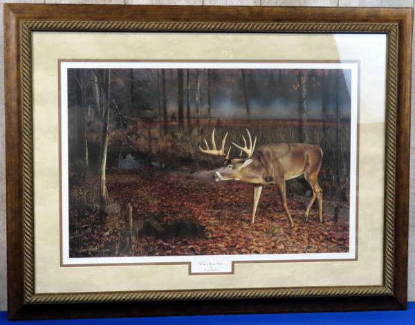 wonderful looking print of white tail buck in the tree; frame measures 27"x36"; very nice frame; glass face; signed & no.298/9800; NO SHIPPING due to glass, local pickup only