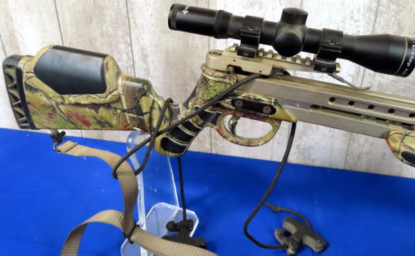 used but nice shape; could use a bit of a cleaning has scope and removable quiver; sling; overall 38" long; no transfer needed