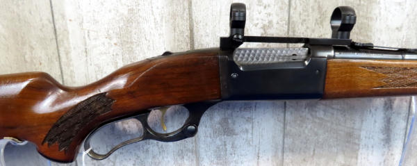 22" Bbl.; smooth action; wood has nice finish w/good checkering; couple hairline cracks behind the receiver on top of stock, nothing real serious; scope rail w/rings; gold trigger; USA; SN#A023854; A-107