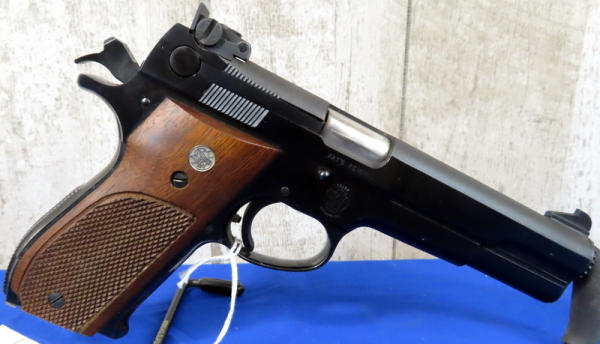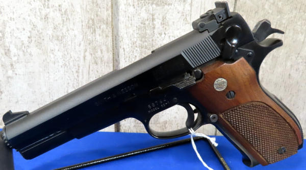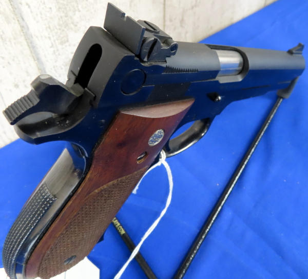 5" Stainless barrel; wood checkered grip; adjustable rear sight; two magazines; factory box has some damage & wear; used but overall very nice condition; USA: SN#59764; A-77
