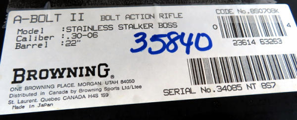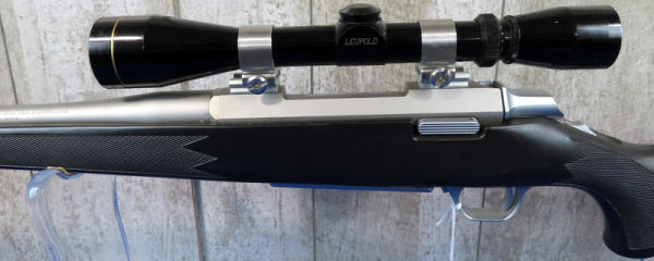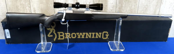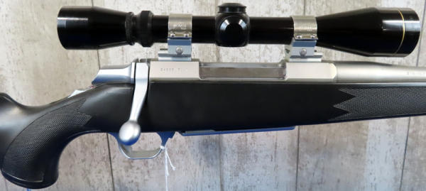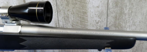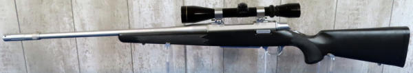 22" Stainless barrel w/adjustable flash hider; black synthetic stock; smooth action; used but great condition; Leupold 3x9 Vari-X IIIc scope; factory box; Japan; SN#34085NT8S7; A-74