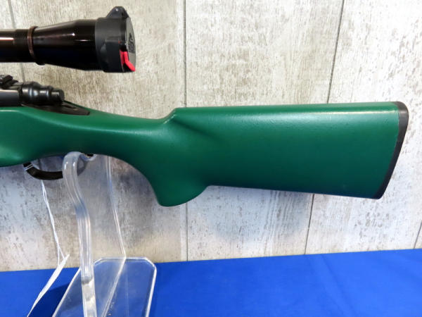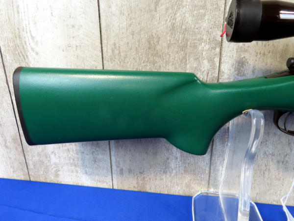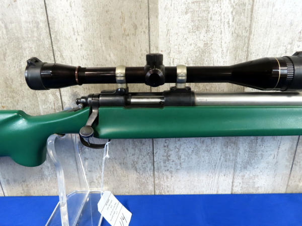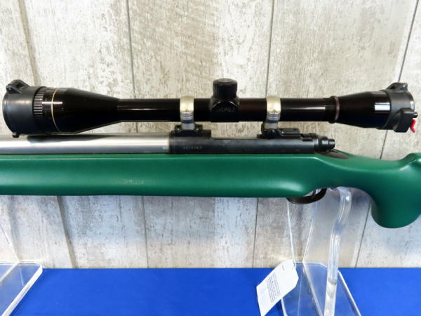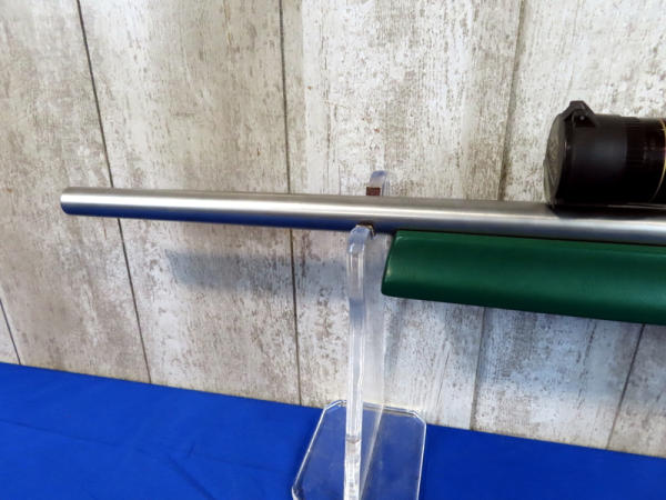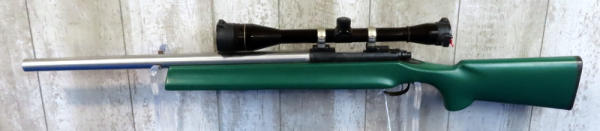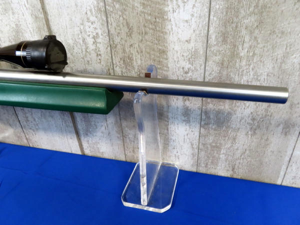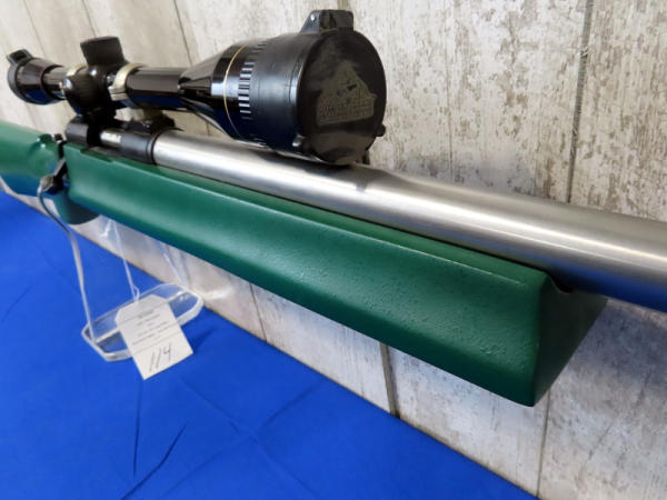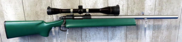 22" Heavy Stainless Bull Barrel; green stock w/thick forearm; 2-oz. Jewel Trigger; Leupold 24X scope; smooth action; USA; SN#061649R; A-77