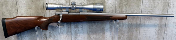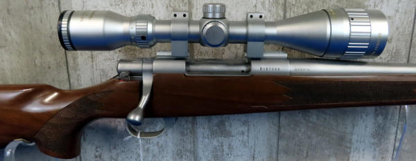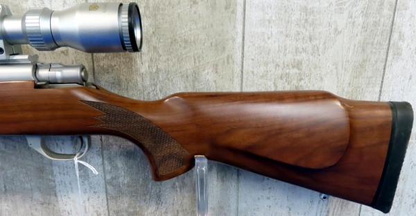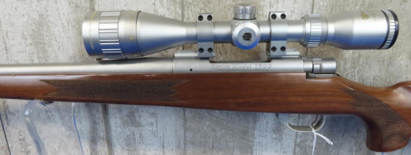 22" Stainless barrel; smooth action; very nice stock w/good checkering; Nikko Sterling Gameking 3.5-10x44 scope; Japan; SN#B187568; A-104