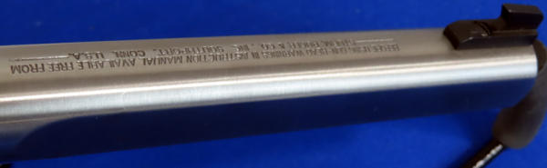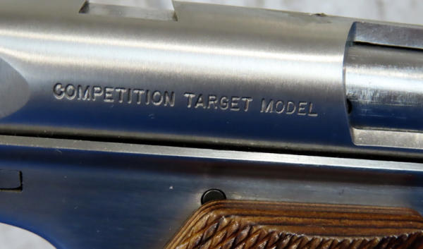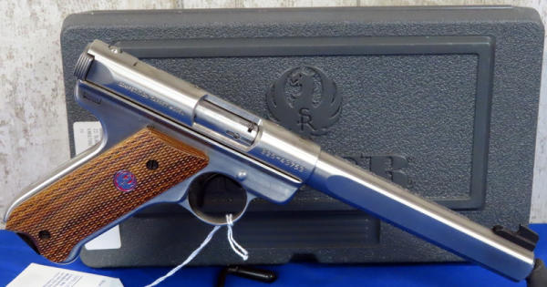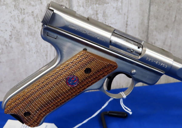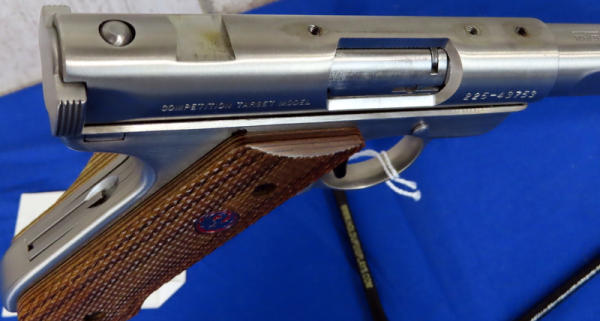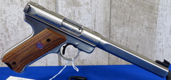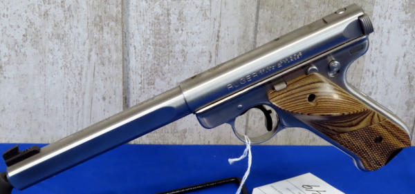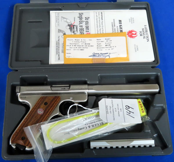 6.75" Stainless barrel; factory wood checkered grips; one magazine; factory hard case; nice gun; USA; SN#225-43753; A-96