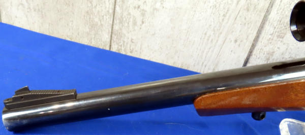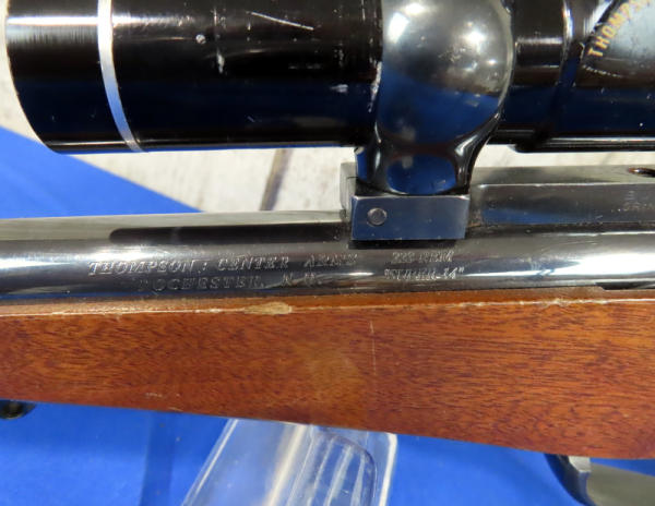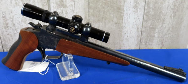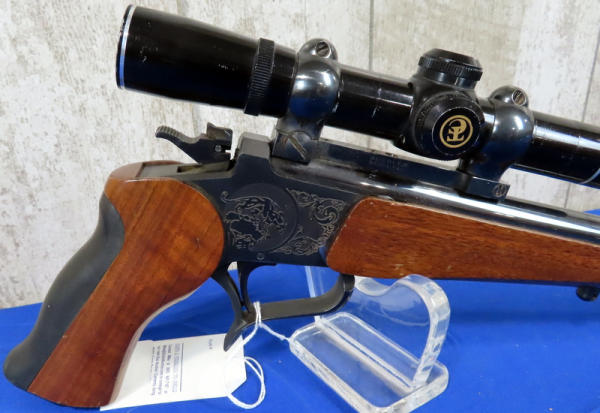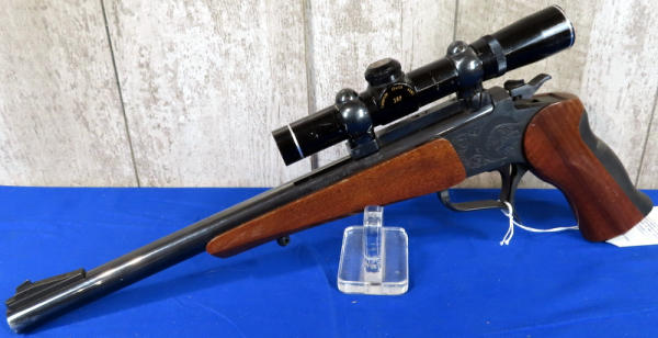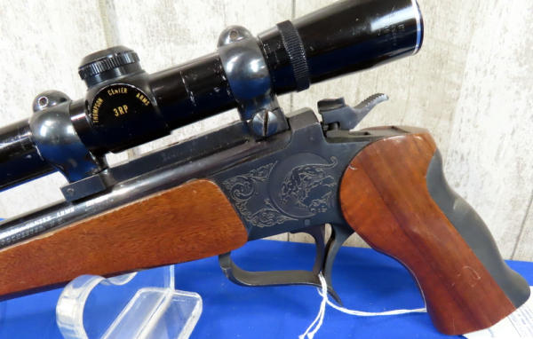 14" Bbl.; easy break action; wood has some field marks; T/C 3x20 scope; factory engraved receiver w/Cougar; USA; SN#335794; A-61