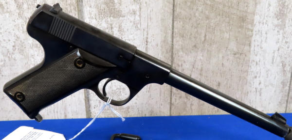 6.75" Bbl.; plastic checkered grips; one magazine; nice and clean; mfg.1934; USA; SN#10597; A-82