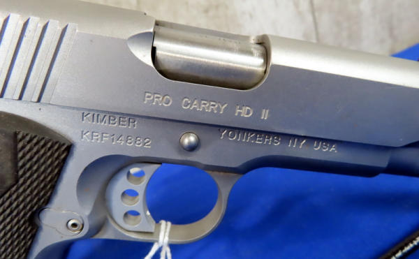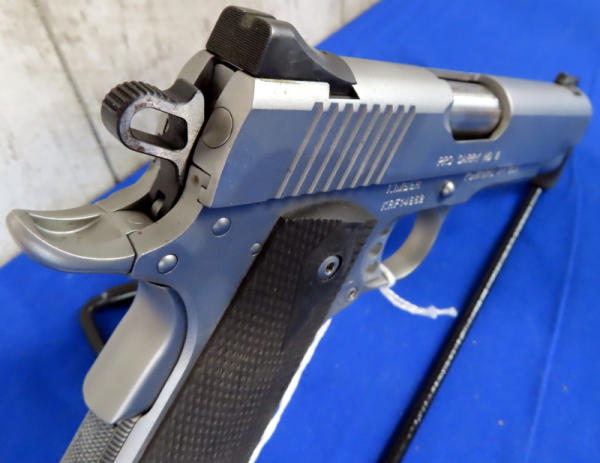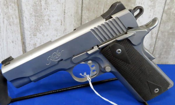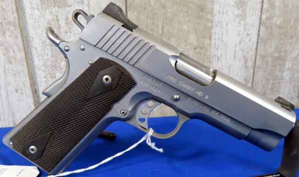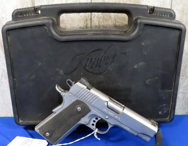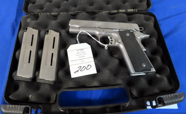 4" Stainless barrel; rubber checkered grips; factory hard case; 2-magazines; used, needs a little cleaning; USA; SN#KRF14882; A-77