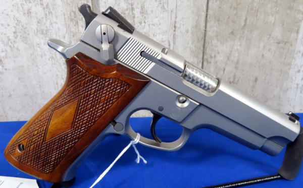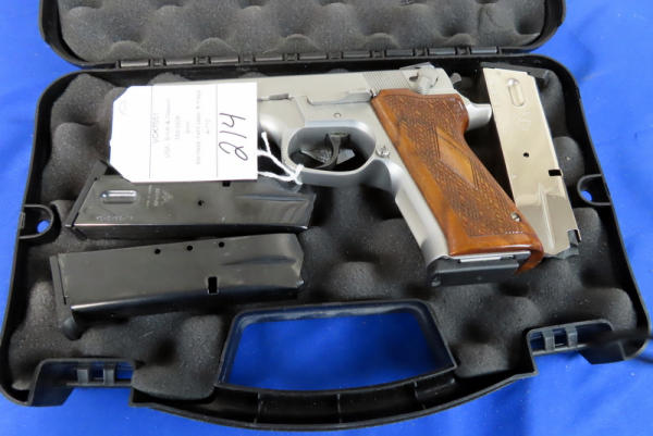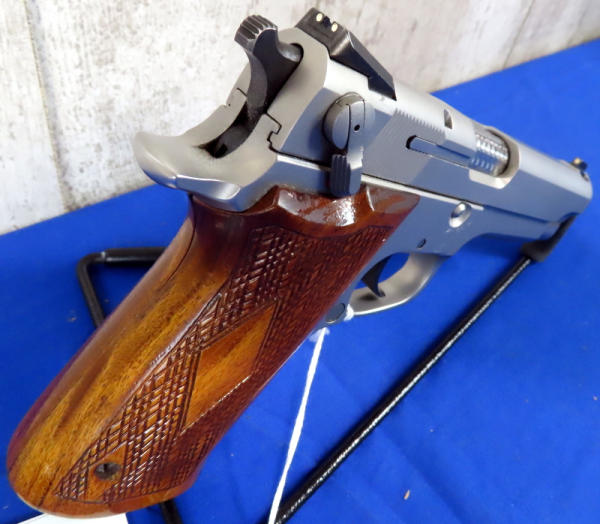 4" Stainless barrel; wood checkered grips w/high gloss finish; night sights; 4-magazines; non-factory hard case; USA; SN#VCK7551; A-110
