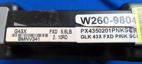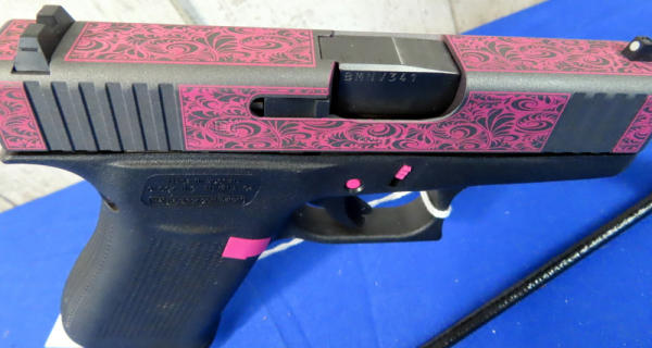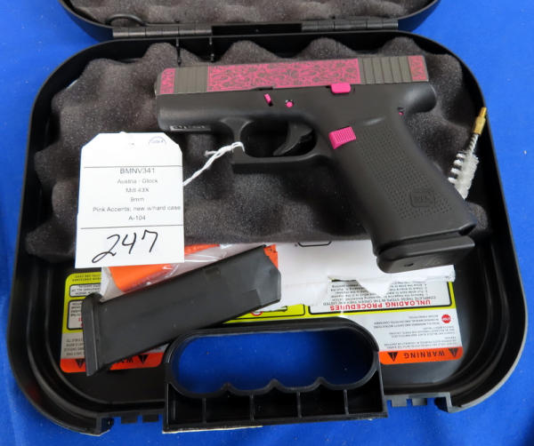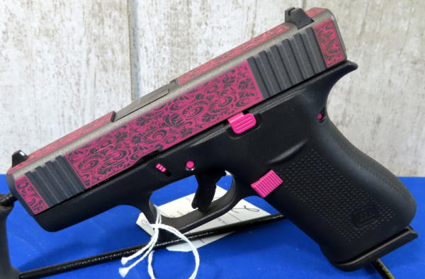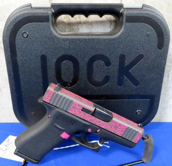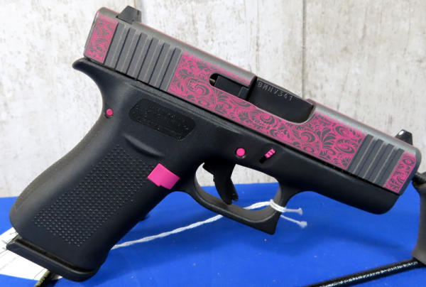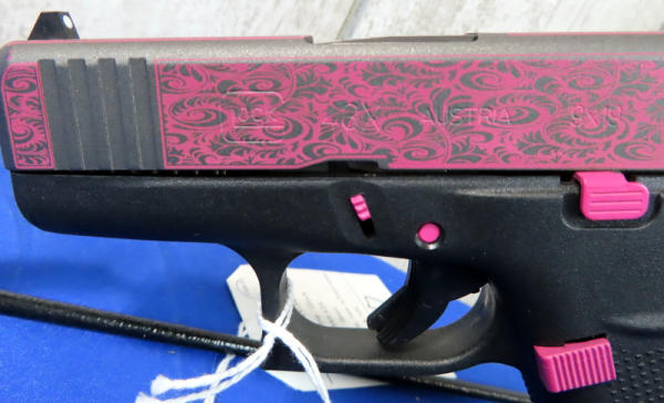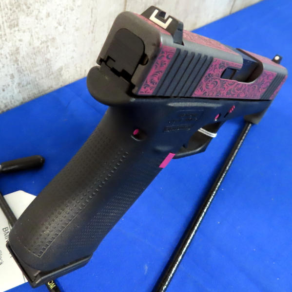 3.25" Bbl.; black synthetic frame; pink scroll graphics on slide and pink accents on frame; night sights w/rear white outline; factory hard case; 2-magazines; Austria; SN#BMNV341; A-104