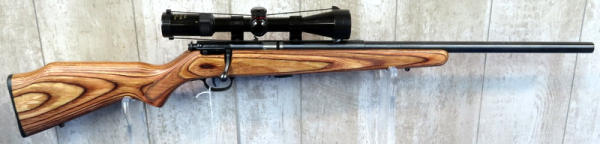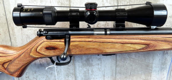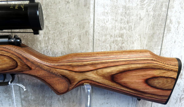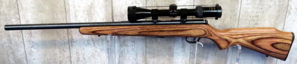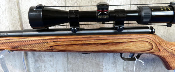 21" Bull Bbl.; smooth action; removable magazine; wood grain laminate stock; Simmons ProHunter 3-9x40 Scope; like new; USA; SN#0853997; A-104
