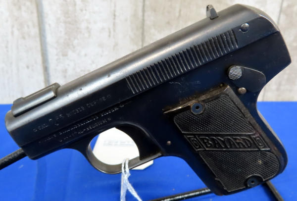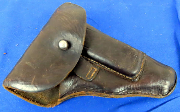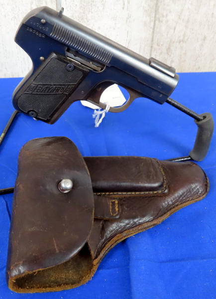 2.25" Bbl.; plastic checkered grips; bluing is dull; period correct leather holster; 2-magazines; Belgium; SN#197462; A-113