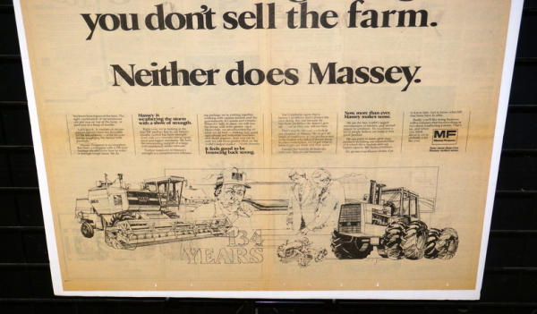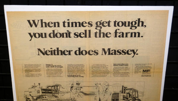 23"x28", great ad from the early 1980's when farming was tough, nicely shrink wrapped to a board to display