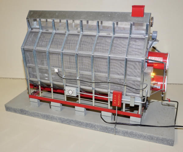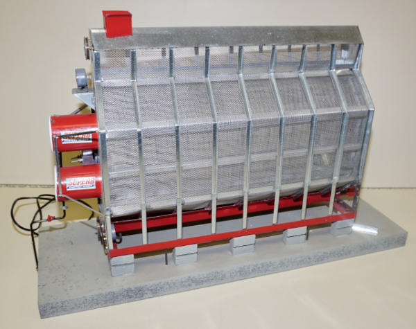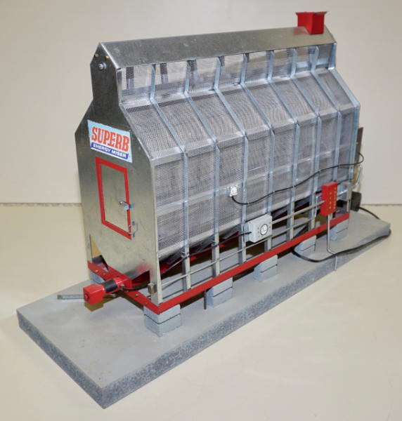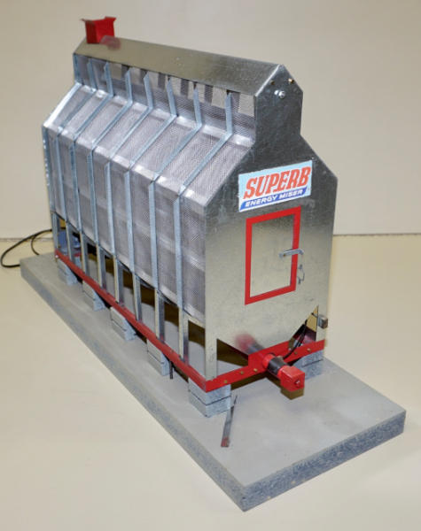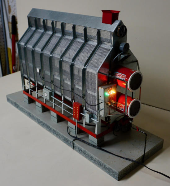 base is 24"x8", stands about 16" tall, 100% scratch built metal with wood base, plug it in and it will run the fans, really great looking piece; no shipping, pickup only