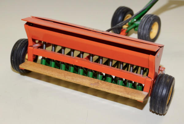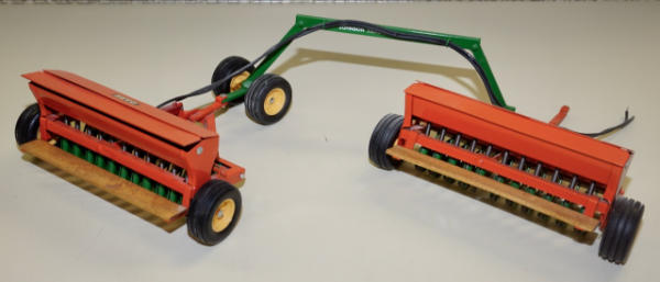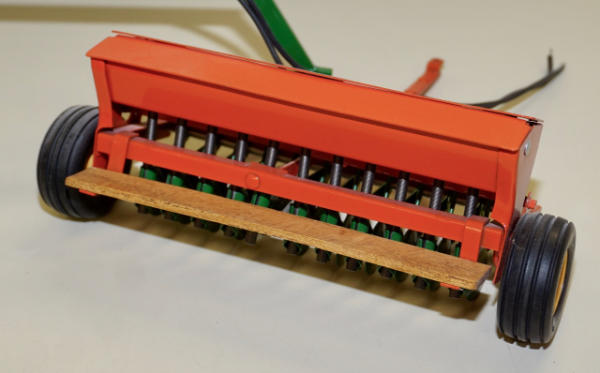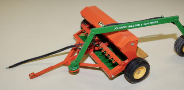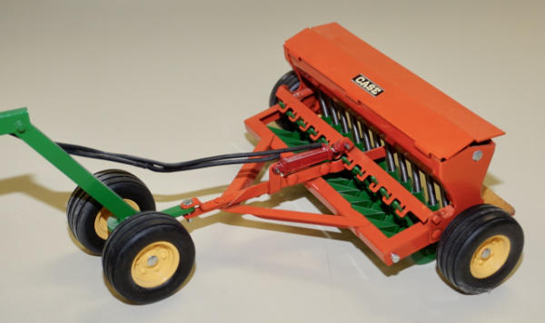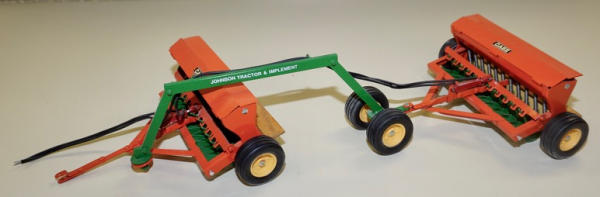 Tru-Scale or JD Grain drill restored and customized to Case, better wheels added and wood platform; has a scratch built "Johnson Tractor & Implement" pivoting hitching, neat set up