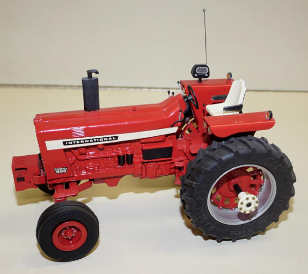 Old casting restored & heavily customized with 3pt hitch, lights, levers, weights, Firestone Tires, axle hubs and radio; don't know the builder, but looks good
