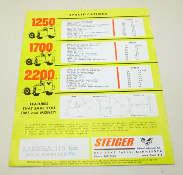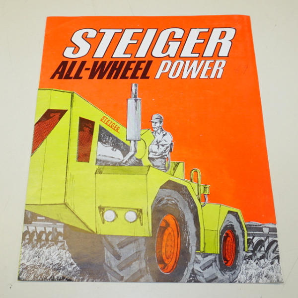 4 pages, clean and nice with some minor wear; this was before Steiger moved to Fargo, rare piece of original literature, has a dealer stamp on the back from Minot, ND