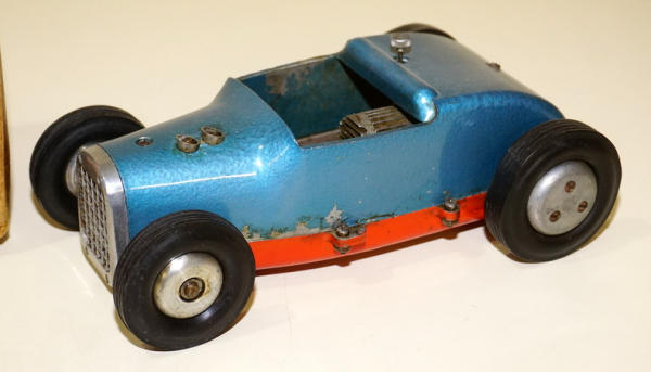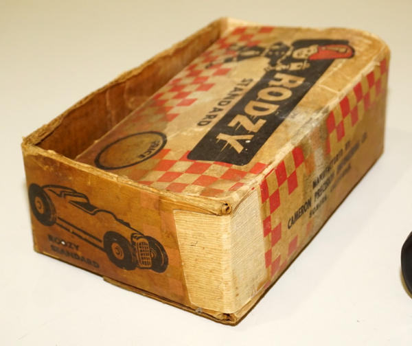 8" long, nice original toy, but has been played with and has some small spots of paint loss, box is complete, but has oil stains and heavy wear