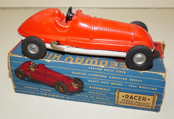 10" long, windup works, plastic is split where the colors meet, box is missing one end and has heavy wear, box rates 6 condition