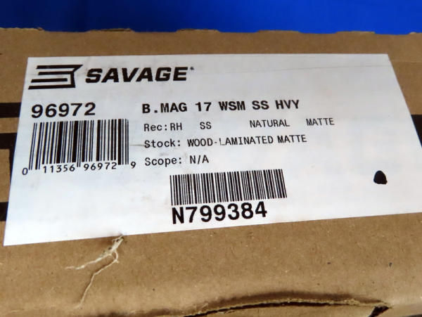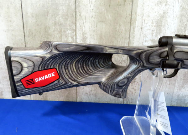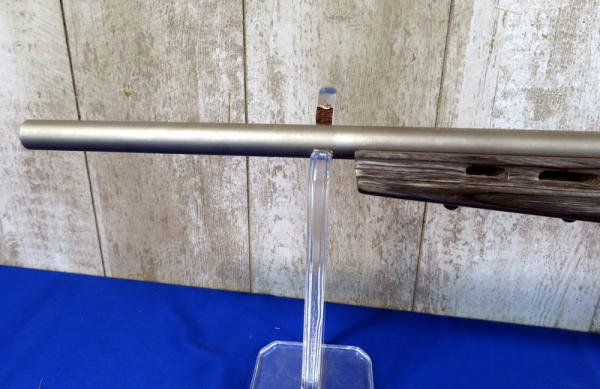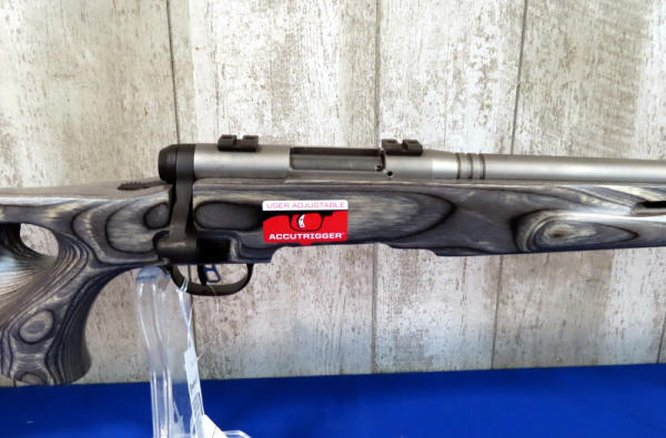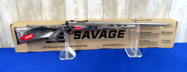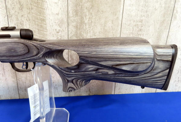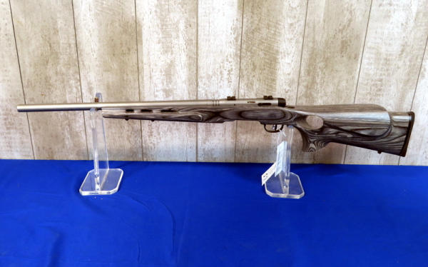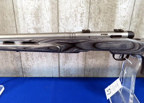 22" Stainless Bull Barrel; grey wood grain laminate stock w/thumb hole grip; scope blocks; removable magazine; smooth action; factory box; mint & unfired; USA; SN#N799384; A-144