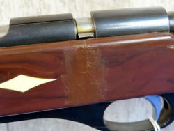 19.5" BBL.; smooth action; Nylon stock has a repair by the trigger where it was damaged at one time, did an OK job repairing it….if not for that repair, the stock is near perfect! Removable magazine; Nice bluing; date code AJ-58; USA: No SN#; A-124