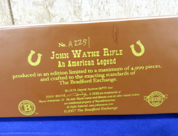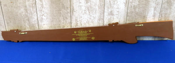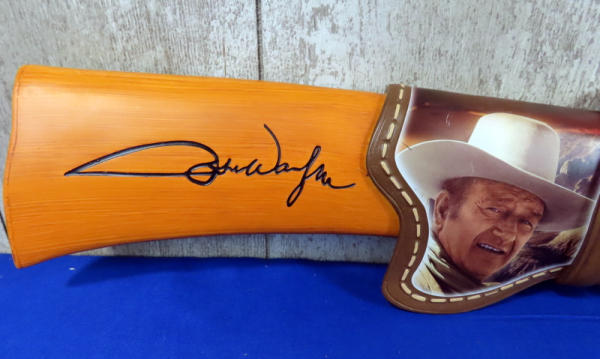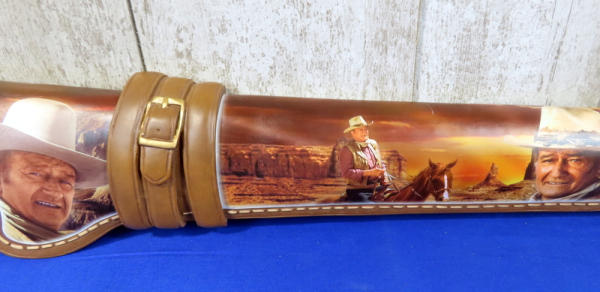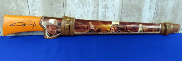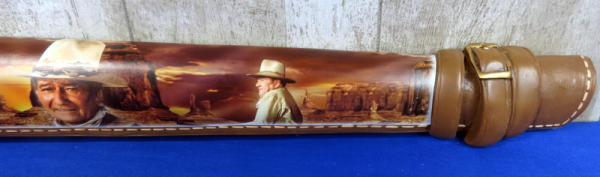size of a regular firearm; 36" long; made of what I believe is a resin cast; wonderful graphics on the scabbard of JW movie scenes; near mint; made in 2007; hangs on the wall; must have to display with your commemorative firearm!