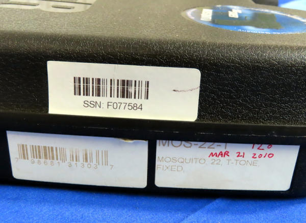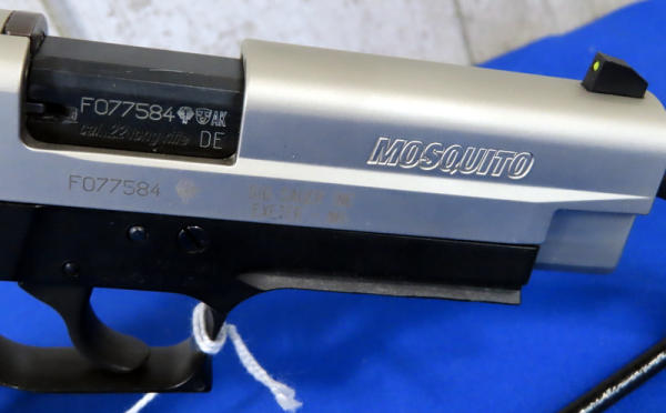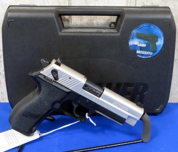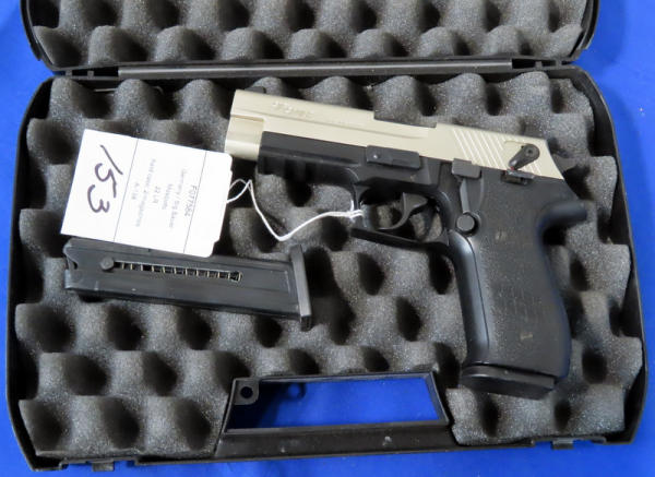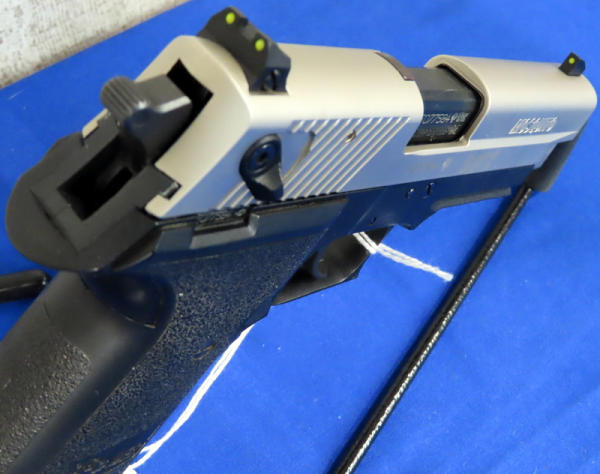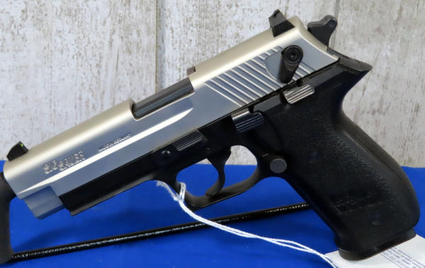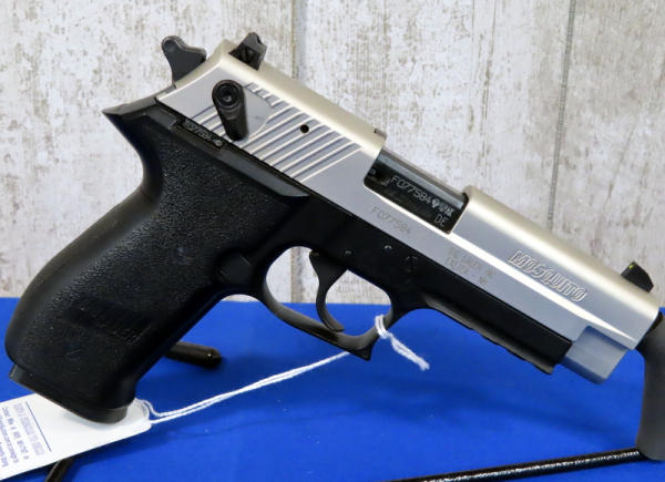 4" BBL; black textured plastic grips; two-tone w/blued frame & stainless slide; yellow night sights; 2-magazines; factory hard case; Germany; SN#F077584; A-138