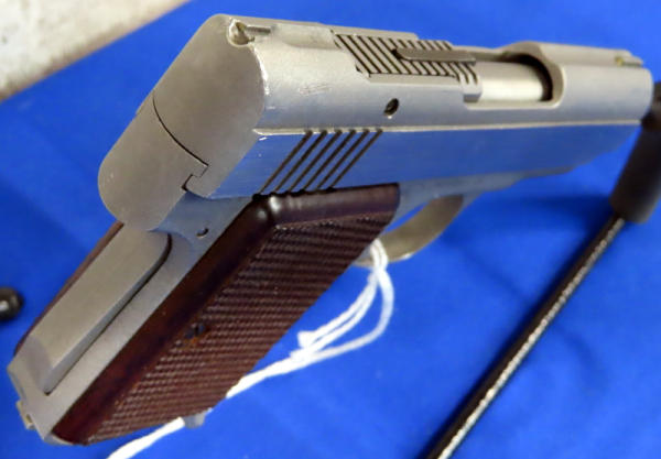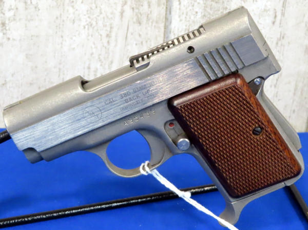 2.5" Stainless barrel; wood checkered grips and also includes original black plastic checkered grips; SP soft leather holster w/magnet flap; one magazine; USA; SN#A95439; A-155