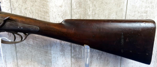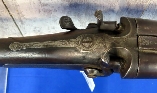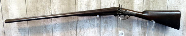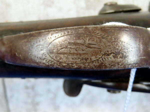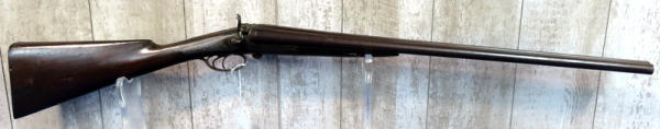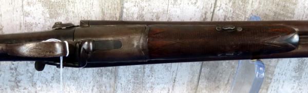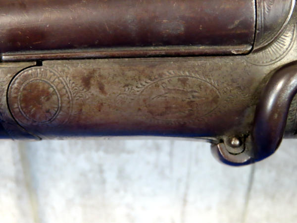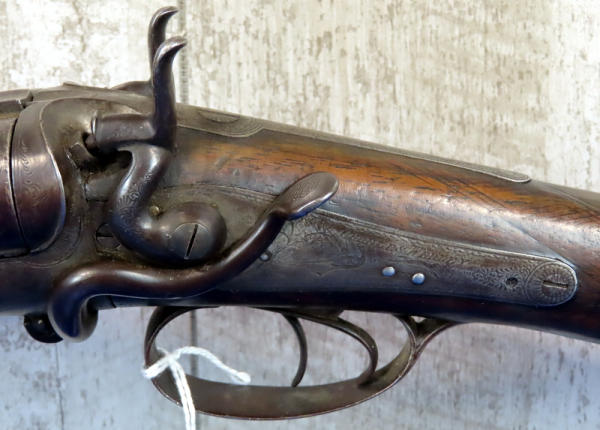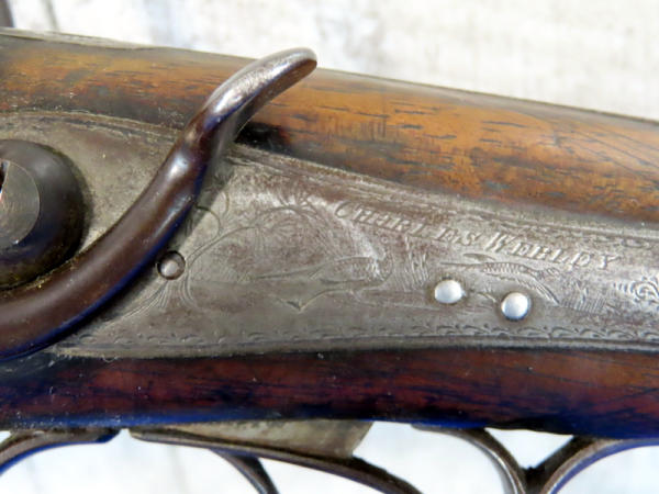 28.5" London Fine Twist Damascus BBLs; easy break action; both mechs work; side thumb release; very fancy engraving around receiver and trigger guard, check pics; nice wood for it's age; England; SN#20444; No Transfer needed