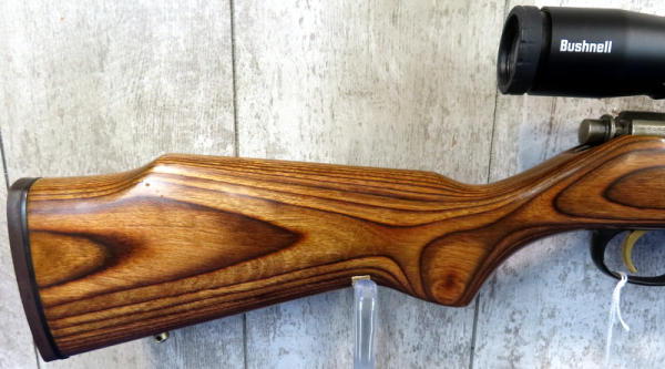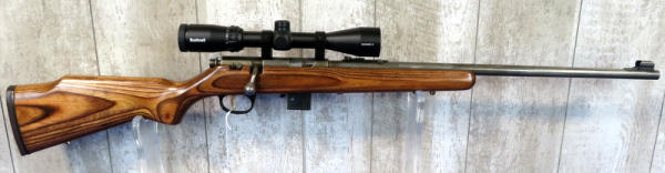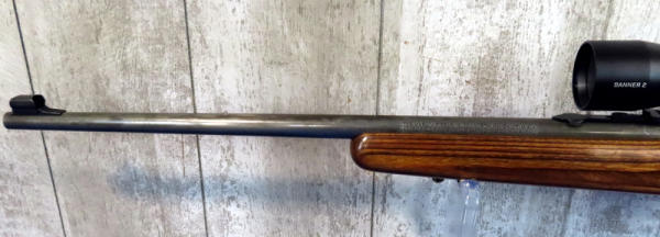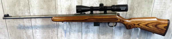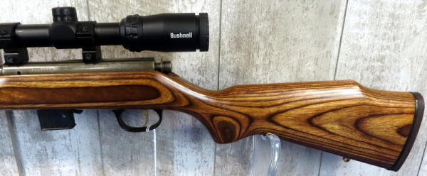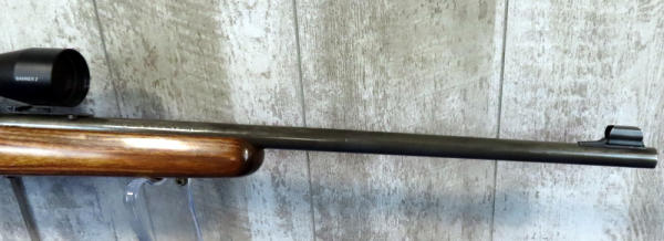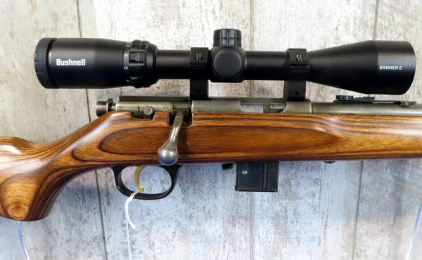 22" BBL.; globe front sight; bluing is thin on barrel; very nice wood stock; Bushnell Banner 2 scope; smooth action; removable magazine; gold trigger; USA; SN#06439257; A-168