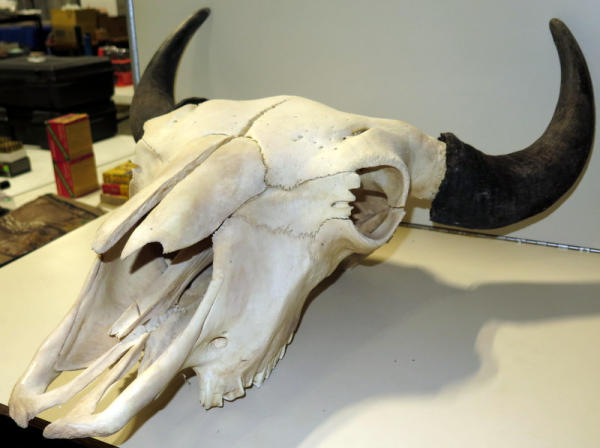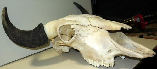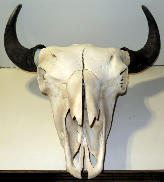 nice skull; has the bullet hole on top of head; tip to tip of horns is 18" wide; entire thing is 27" long
