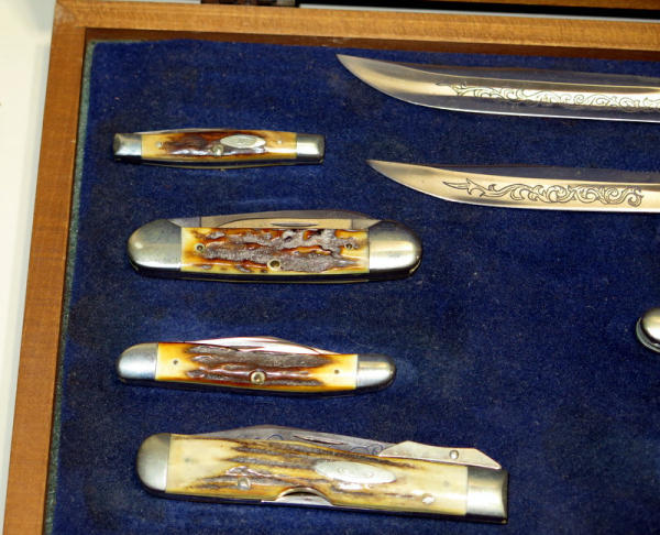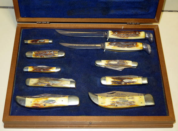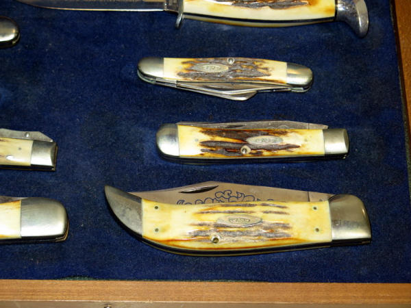 8 folding knives and two fixed blade; all have wonderful looking stag/antler handles w/blue scroll engraving on the blades; largest folding knife is 5.5" folded and smallest is 2.75"; longest fixed blade is 9.5"; wooden box is 14"x10"x3" and does have some scratches on it; believe to be from a 1977 set from what I have researched; buy as a set;