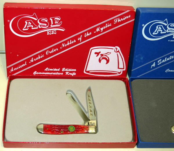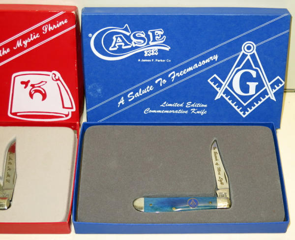 red one is for "Nobles of the Mystic Shrine" and SN#2521 (R207SS) and Blue is "A Salute to Freemasonry" and SN#7109 (B207SS); both are mint condition; both 3.5" folded and original boxes; sell 2x the money
