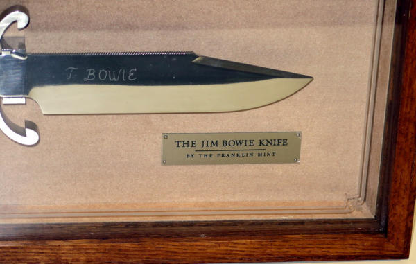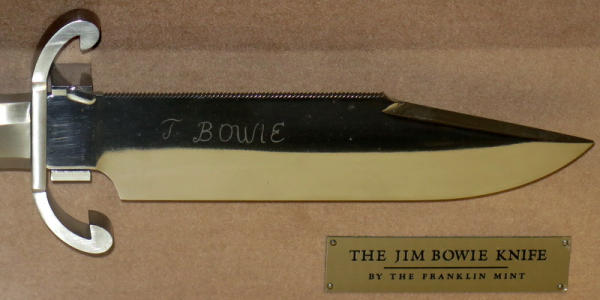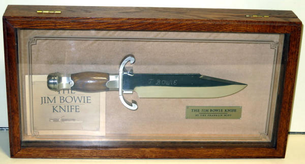 7.5" Blade & 13.5" overall; very heavy made; "J. Bowie" etched on blade; includes a COA; very nice glass front showcase is 19"x10"x3"; mint condition;