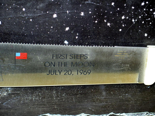 11.25" Blade & 17" overall; SN#598 of only 1,000 mfg.; has moon landing graphics and date on blade; moon-like rock base to hang on! Original box & COA; very cool piece!