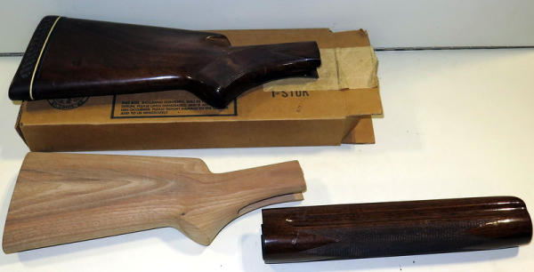 dark stock has a crack that's been fixed; forearm & new stock are nice; sell for one money