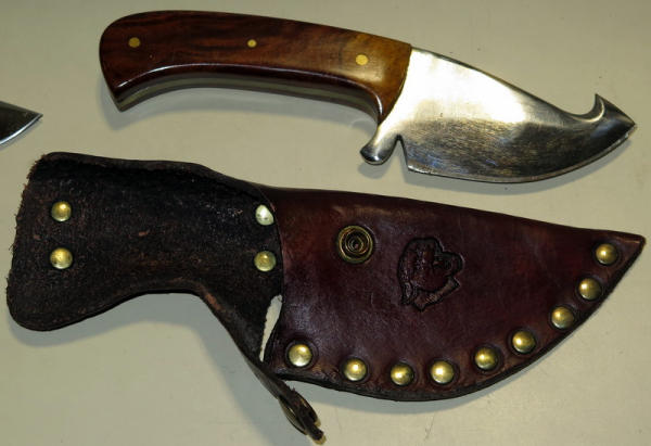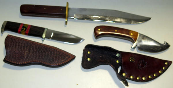 could possibly be custom made; skinner has wood handle & 8.5" overall w/leather sheath; multi-color handle believe is custom w/ "WOLF" stamped on blade, 9" overall w/leather sheath; large bowie believe is custom, not perfect, 15.25" overall; sell for one money