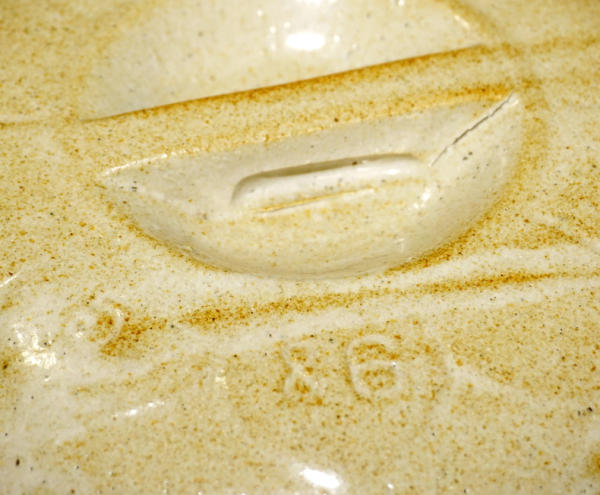13" across, has a chip on the bottom side, nice 5 & 6 marks