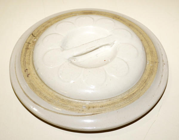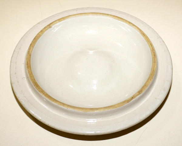 9.5" across, no chips or cracks, nice lid