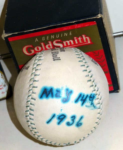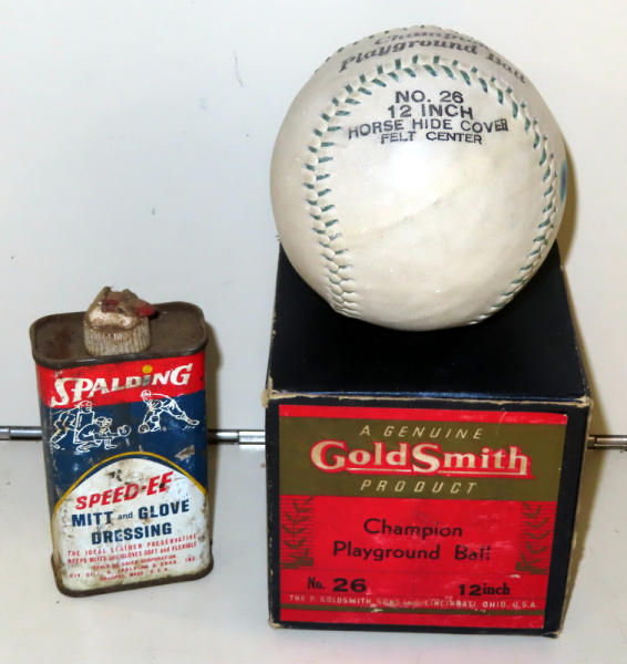 softball is NOS and 12" horse hide w/original box; all mint but the softball has May 14th 1936 written on it; Spalding "Speed-EE" oil can shows wear; sell for one money