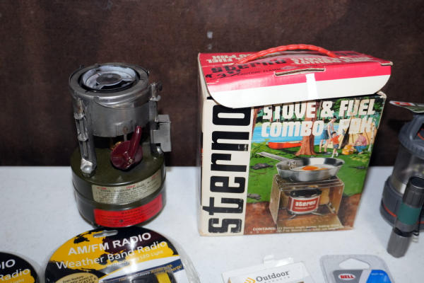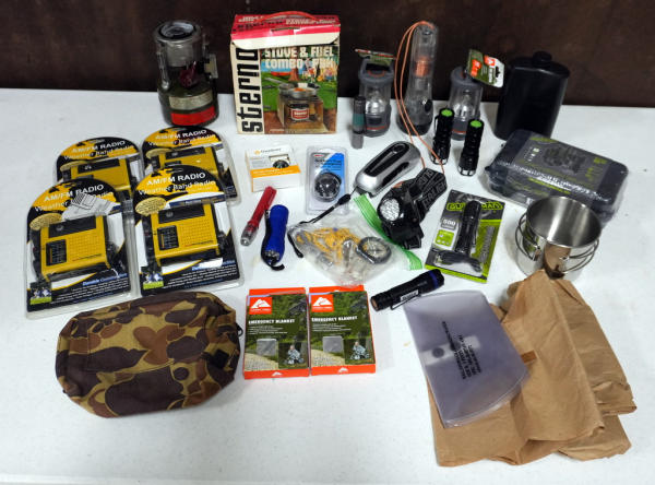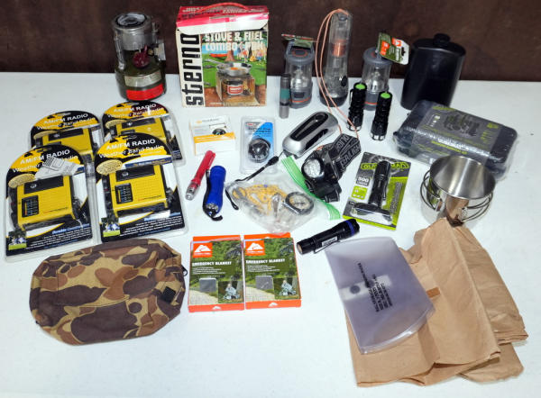 includes a full tote of flashlights, stoves, survival kit, canteens and much more; sell for one money