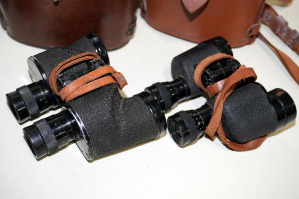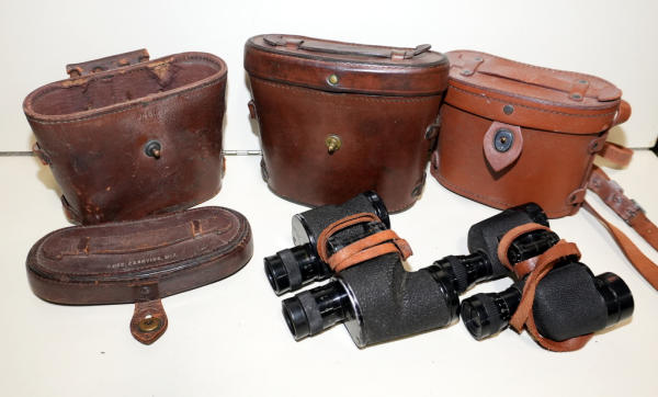 two sets of binocs and 3 cases; all have some wear; sell for one money