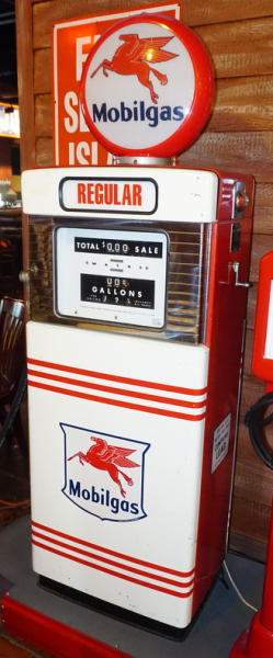slightly different pump than lot #125, this one has ad glass in the top and a sight glass by the SN# plate, nicely restored, but has some scuffs and scratches from being displayed in the Restaurant for the past 21-years; no shipping, pickup in Bismarck only; includes a reproduction Mobilgas globe, lights up and works good