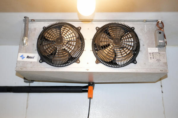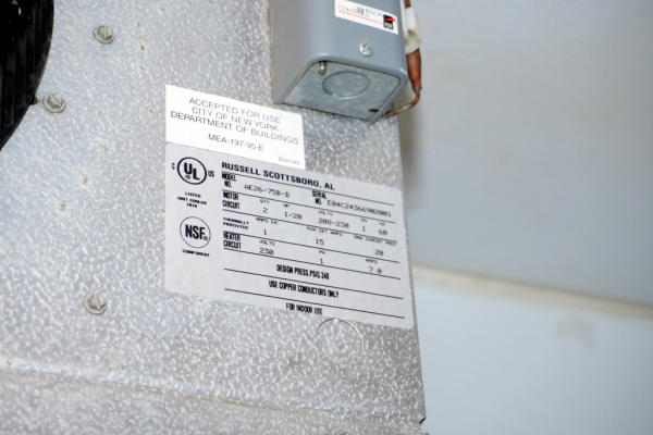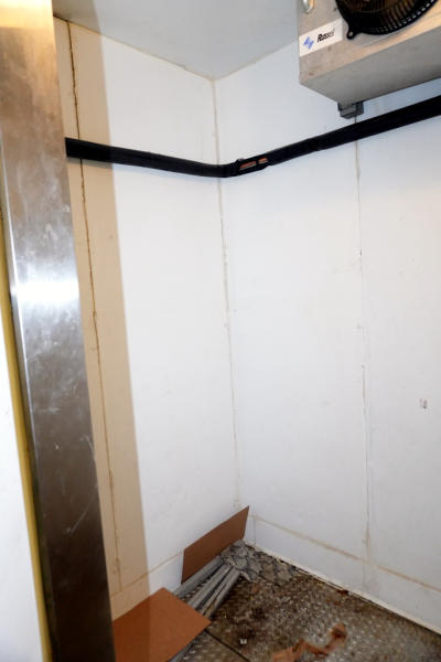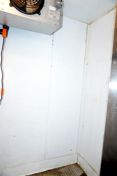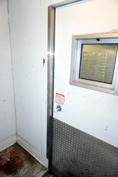 holding area is approx. 8'x4'x8'; has Russell condenser w/compressor on the roof; comes w/all four sides, the side w/the walk-thru door goes w/this freezer NOT the cooler; buyer is responsible for removing; Buyer must make arrangements to remove; Large Item Load Out