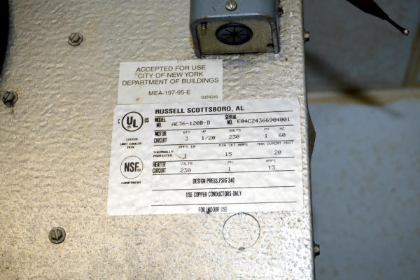 wall w/the walk-thru door to the freezer IS NOT included in the cooler; you get the other three sides; has two Russell condensers w/compressors on roof; holding area is approx. 21'x8'x8'; racks inside are NOT included; buyer responsible for removal; must make arrangements to remove; kitchen; Large Item Load Out