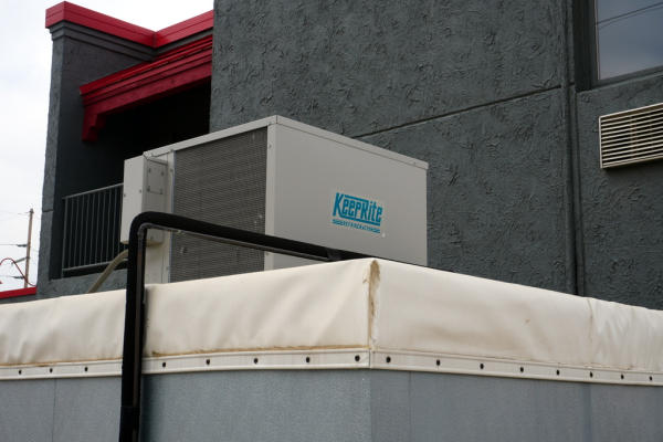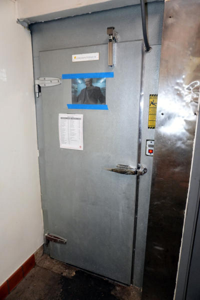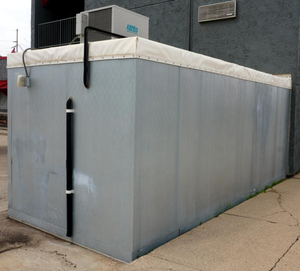 this cooler is only a few years old, very nice and clean; has one Keep-Rite Condenser; compressor is outside; holding area is approx. 13'x7'x7' w/a 4.5'x4.5' entrance area; easier to remove than others; has one walk-thru door; racks inside do not go with; buyer responsible for removing and must make arrangements; kitchen; Large Item Load Out
