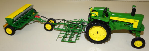 Ertl high detail tractor, scratch built spring tooth, Ertl high-detail drill with custom dolly hitch, really sharp outfit that is all assembled, No shipping, looks like it would be hard to disassemble without cutting the hitch mounts