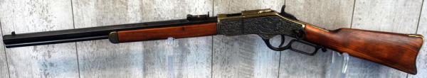 fairly heavy, looks real from a distance; no maker or marks anywhere; action & hammer work like a real gun; very fancy engraved; 38" long